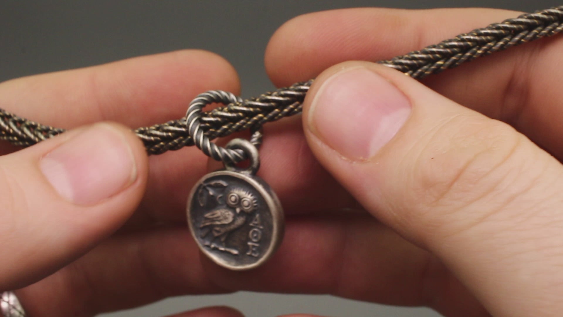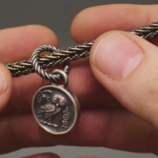 One side based on the coins in circulation 480–420 BC, is the Owl of Athena with "ΑΘΕ", an abbreviation of ΑΘΗΝΑΙΩΝ, translated - "of the Athenians".