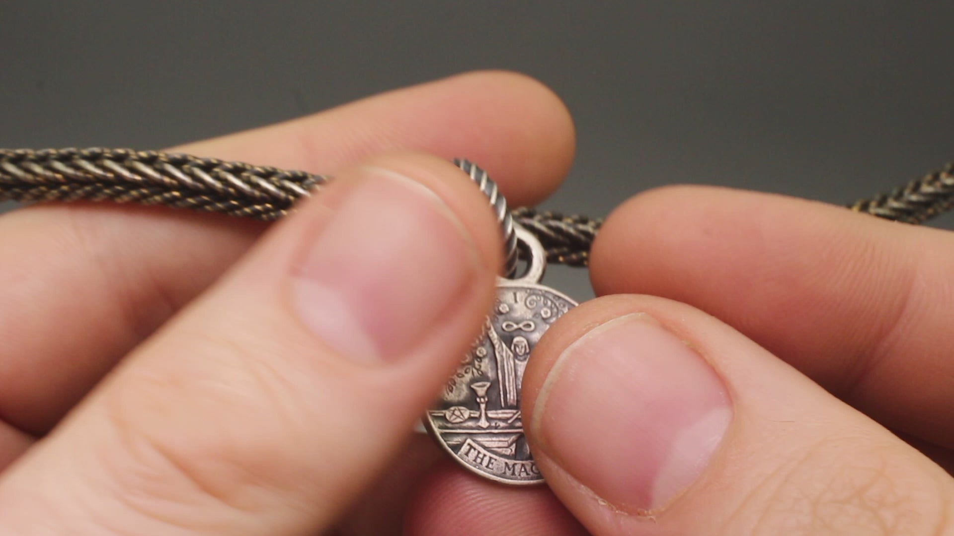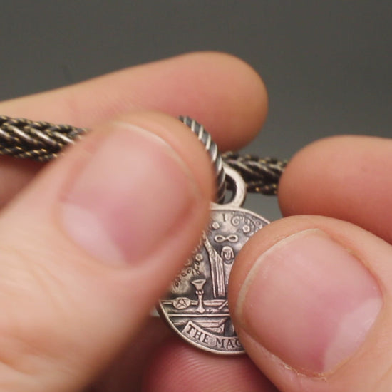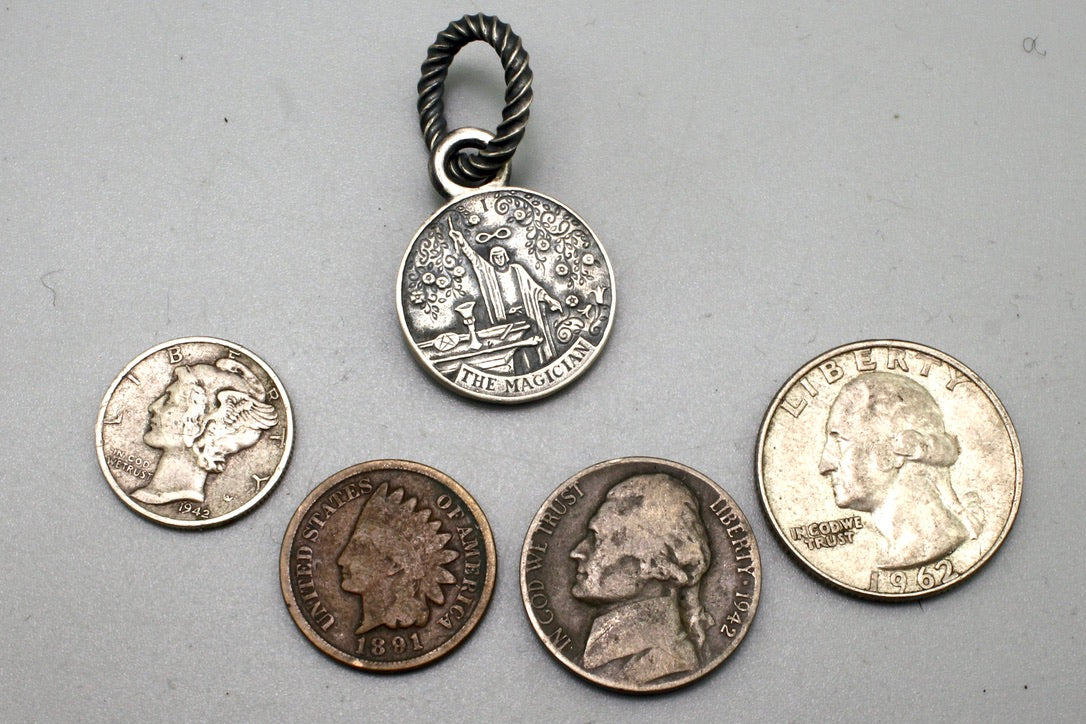 This Medallion is card 1, the Magician, from the Rider - Waite Tarot deck engraved on one side, and the back is also based on the back of the original deck of cards.